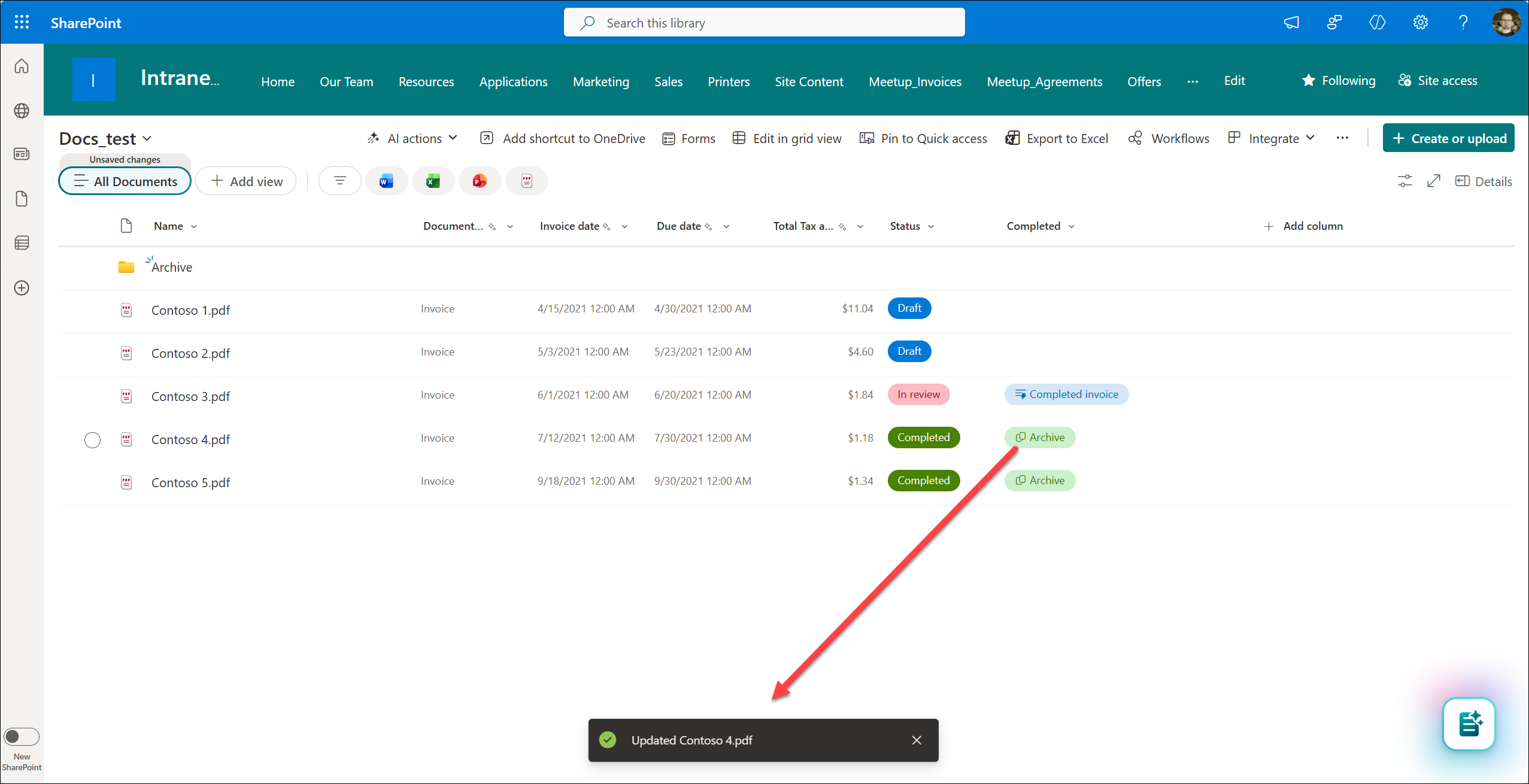 7. Now you can confirm and create the column or add another Quick step. You select more than one to provide different actions in one column. In this example, I selected the Completed Invoice and the Archive steps. The first one changes status to Completed, and the second one copies a file to an Archive folder.