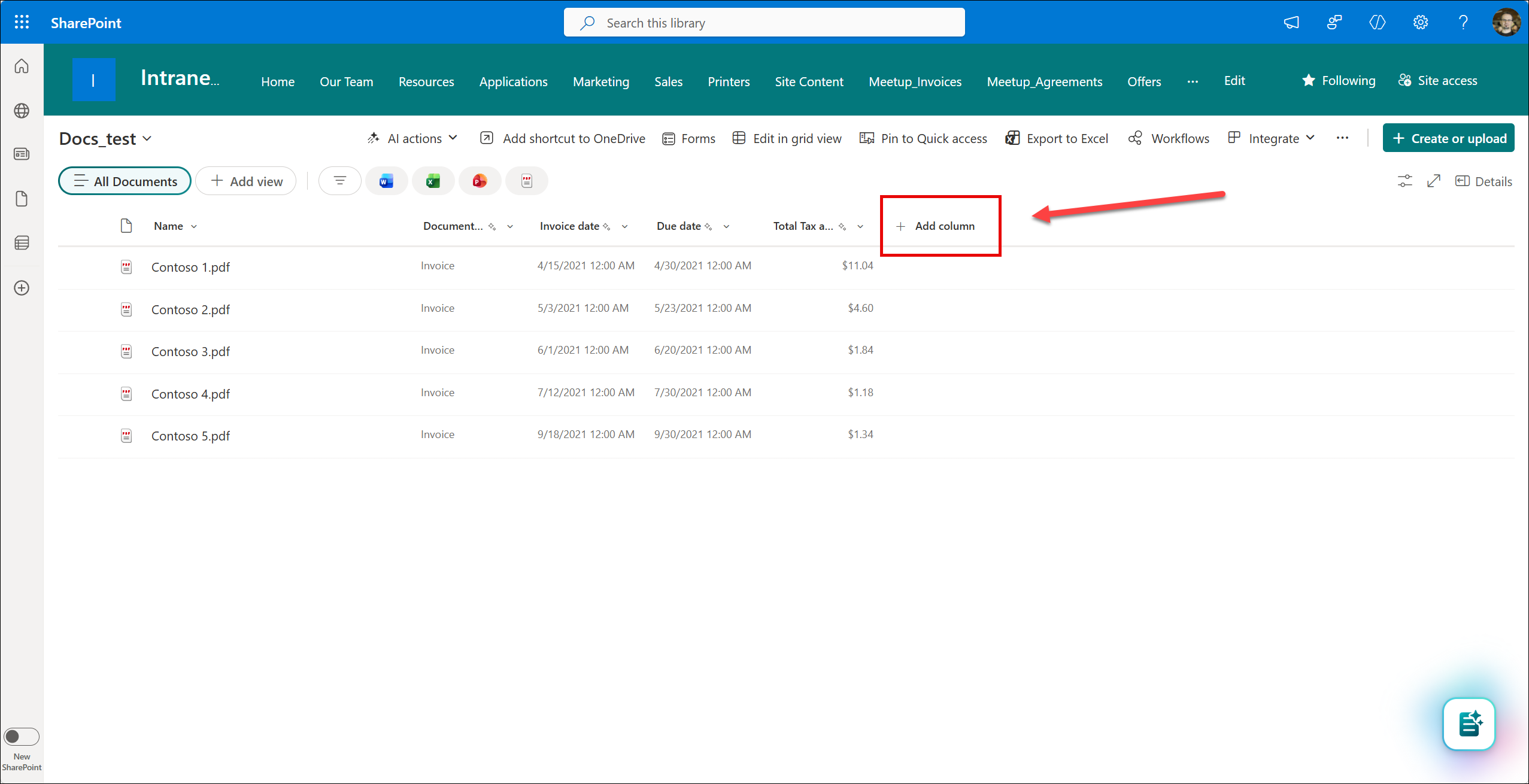 1. Navigate to a list or a library and select the Add column button.