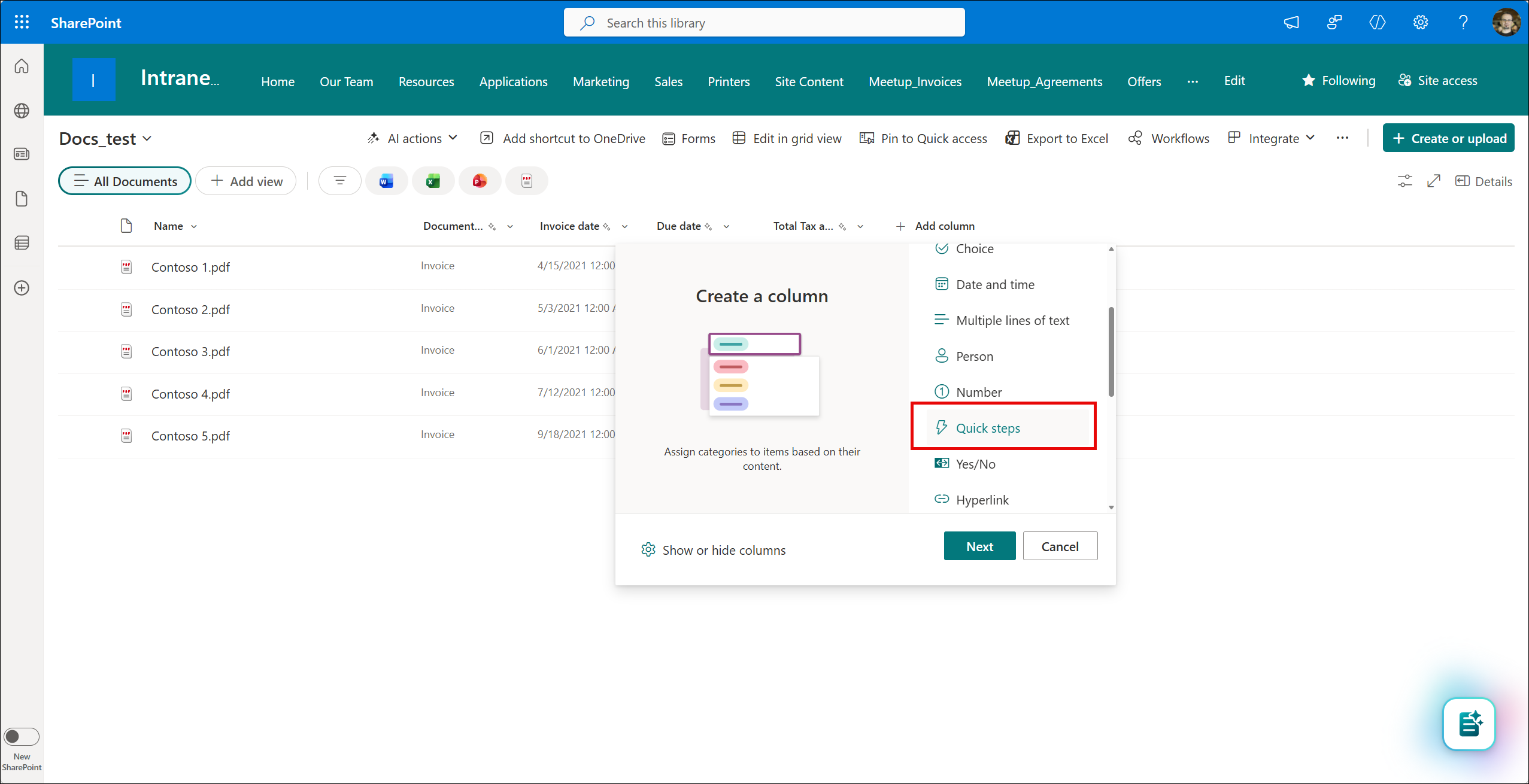 The Quick steps column is the evolution of the Quick step feature that is available at the list/library level. When you create a Quick step in a list, you can use it through the item menu.