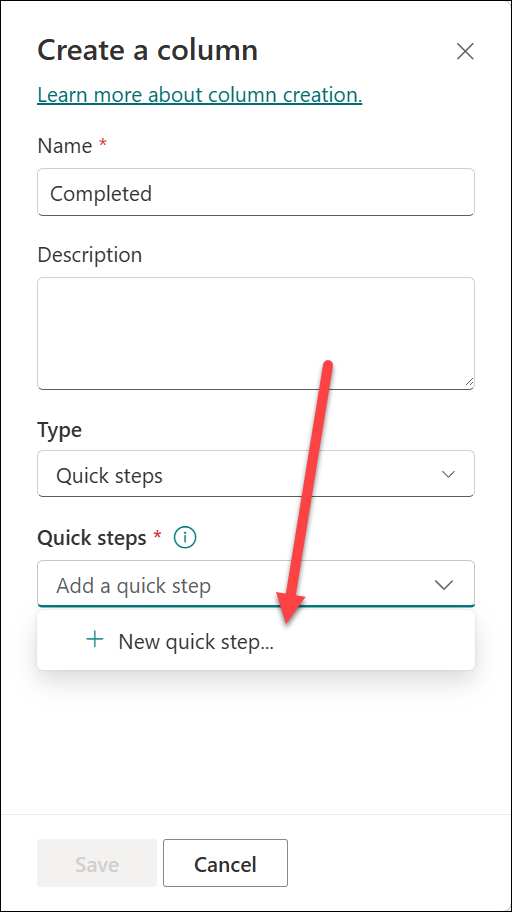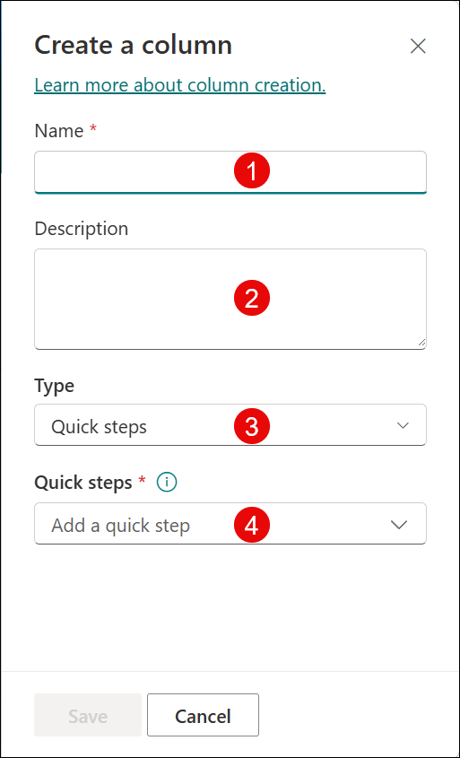 3. Provide the required information. Enter a column name (1) and provide a description (2). Then select the Add a quick step dropdown.