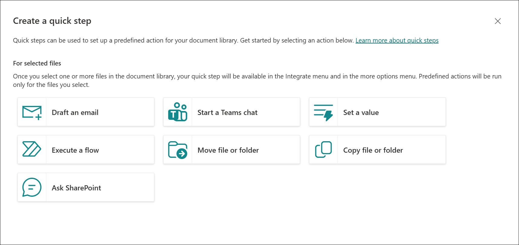 There are 7 Quick steps – 4 in lists and 7 in libraries.