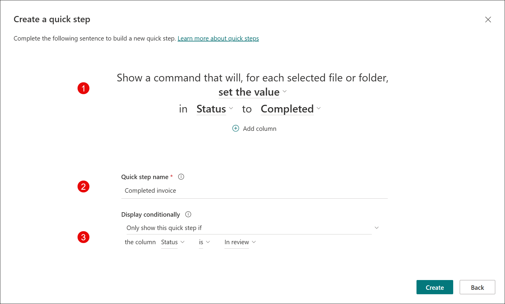 6. Configure your Quick step. Each one has different settings and options. In this example, I have to select a column and a value (1). Then the quick step will change the value in the selected column to the defined one. Provide a name (2) and the conditions when the Quick step is visible (3). When it’s done, select the Create button to finish the process.