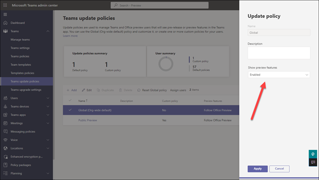 Shared Channels are available only in the Public Preview mode. You can enable it in Teams Admin Center. Open Teams blade -> Teams update policies and edit a specific policy (in my case it is Global policy. Set the Show preview features to Enabled.