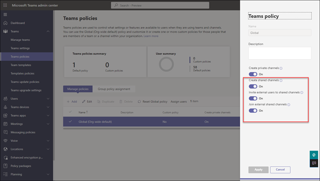 The next step is to enable shared channels in Teams policies. In Teams Admin Center go to Teams -> Teams policies and open your policy (in my case it is the Global one). Now you must enable all settings related to Shared channels.