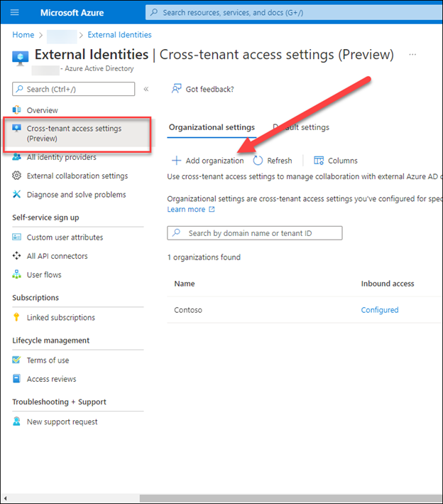 - Navigate to Azure AD and go to External Identities and open Cross-tenant access settings (Preview) and click + Add organization