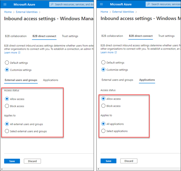 4. Open Inbound access, go to B2B direct connect and allow access to External users and groups, and Applications