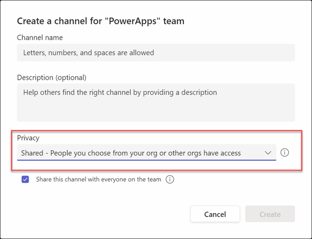 Creating a shared channel is quite simple – create a channel as usual and from the Privacy dropdown select Shared.