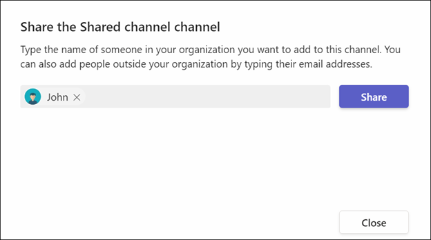 Let’s start simple and share a channel with someone from our organization. Type a name or an email and click the Share button.