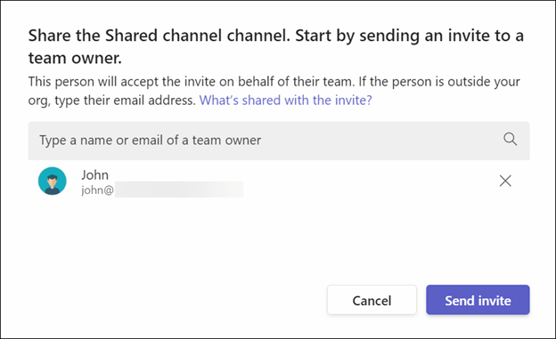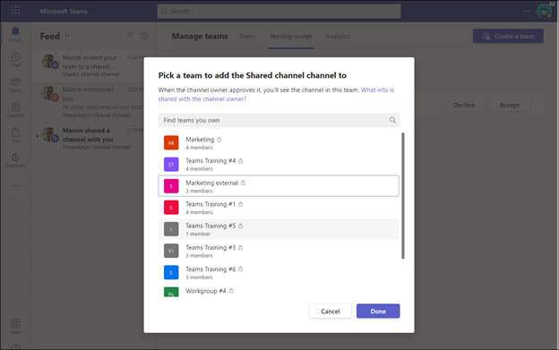 This option allows you to share the channel with teams you own. You can select a team from a list and that’s it. Now every member of the selected team has access to the Shared channel.