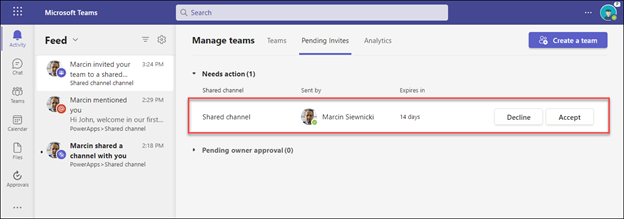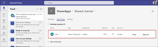 4. Now the process goes back to the Shared channel owner. You can see which team was selected by the invited owner and approve it or deny it. You have 14 days to do that.