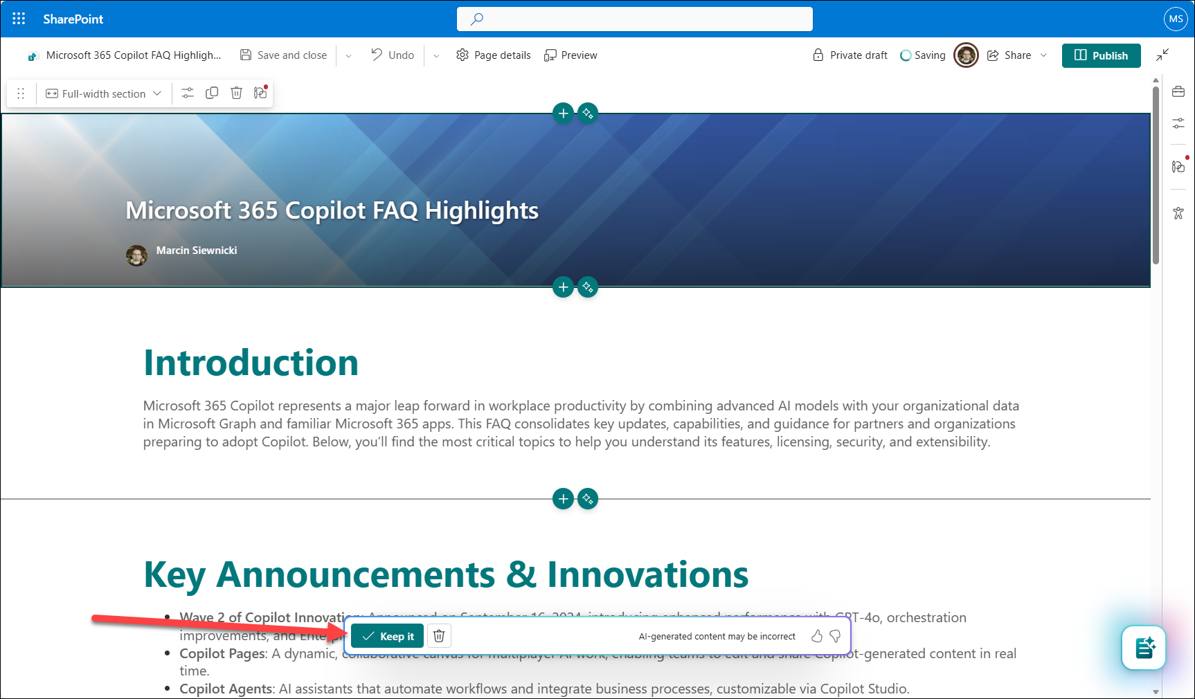 6. On the SharePoint page, you will see a created page with content and images. Now you can work with it just like you do when you create a page with AI directly from SharePoint. You can verify the content, approve it, etc.