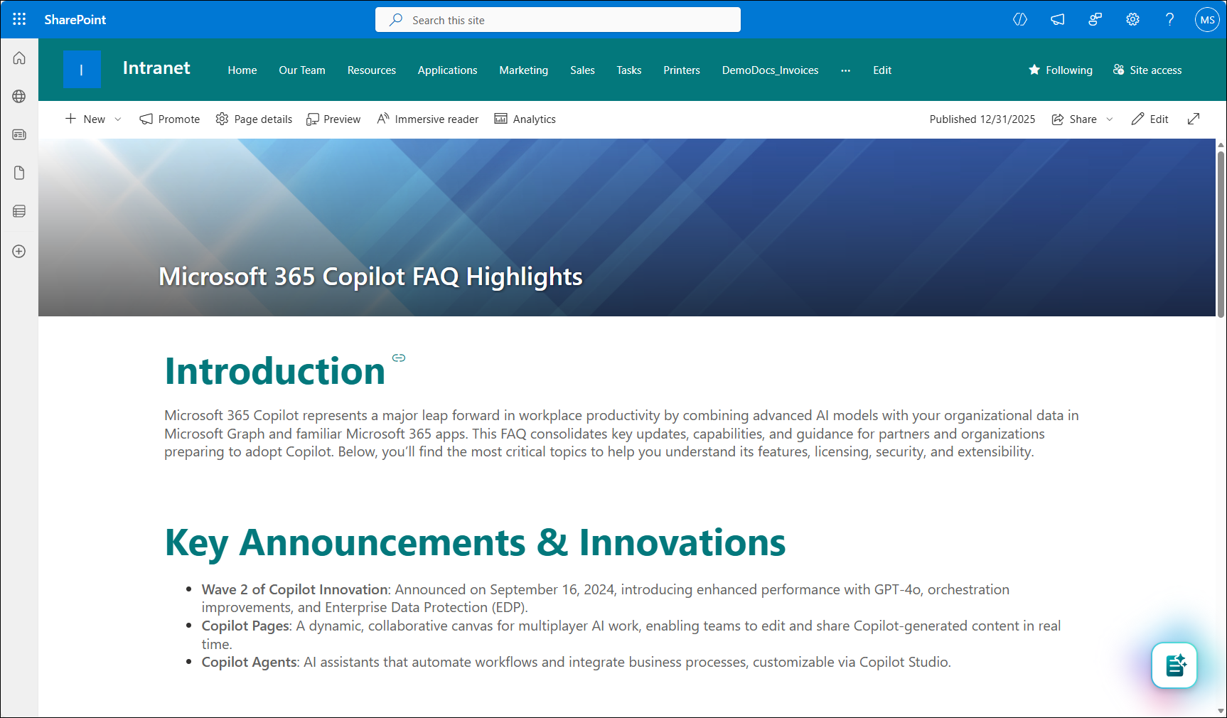 Microsoft released a new AI agent for Microsoft 365 Copilot – SharePoint page agent. It’s designed to actually do something instead of just generating content based on your prompts. You can use it to transform your text into a ready-to-publish SharePoint page.