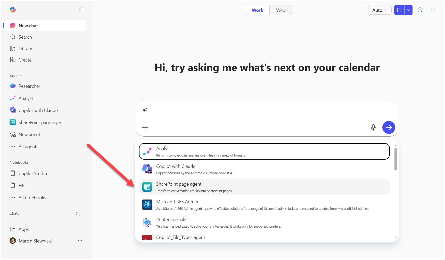2. Type the @ sign in the Microsoft 365 Copilot chat and then select the SharePoint page agent from the drop-down menu.
