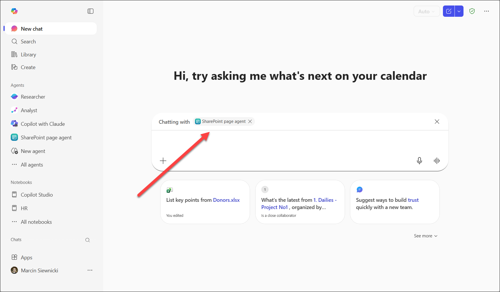 1. Select the SharePoint page agent from the left-hand navigation pane and use it as a standard Copilot chat.