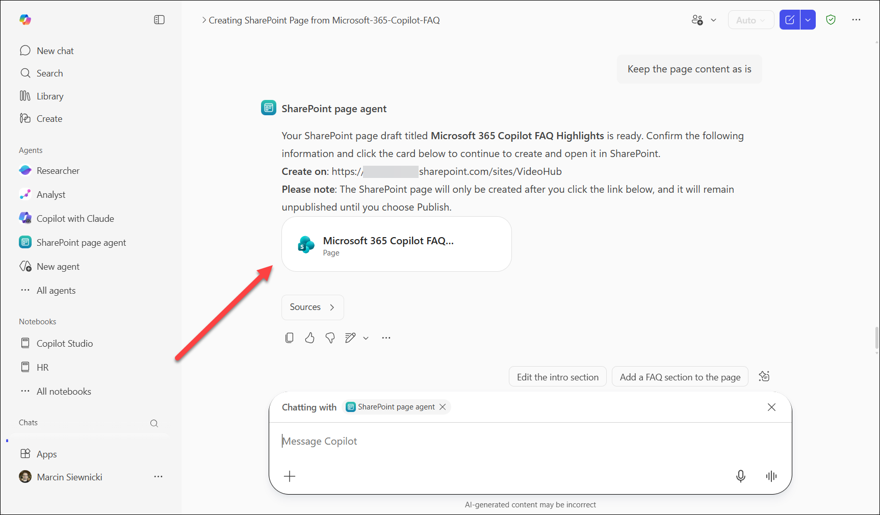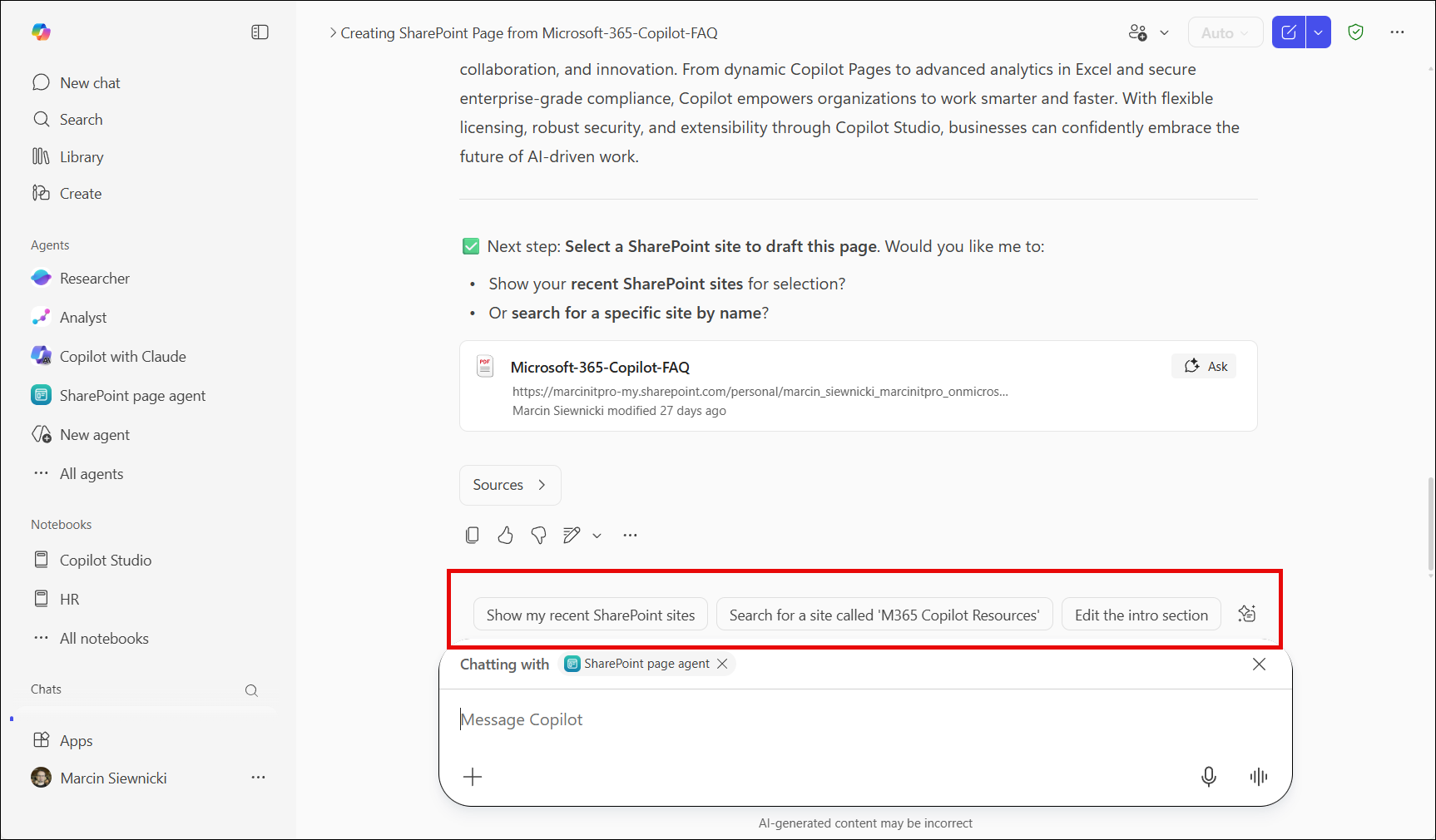 The whole process is straightforward and really fast. You don’t need to copy content between chat and SharePoint or copy a prompt from Copilot to SharePoint AI-wizard. Instead, you can start wherever you want and use the agent to finish the job and create a page on a selected site.