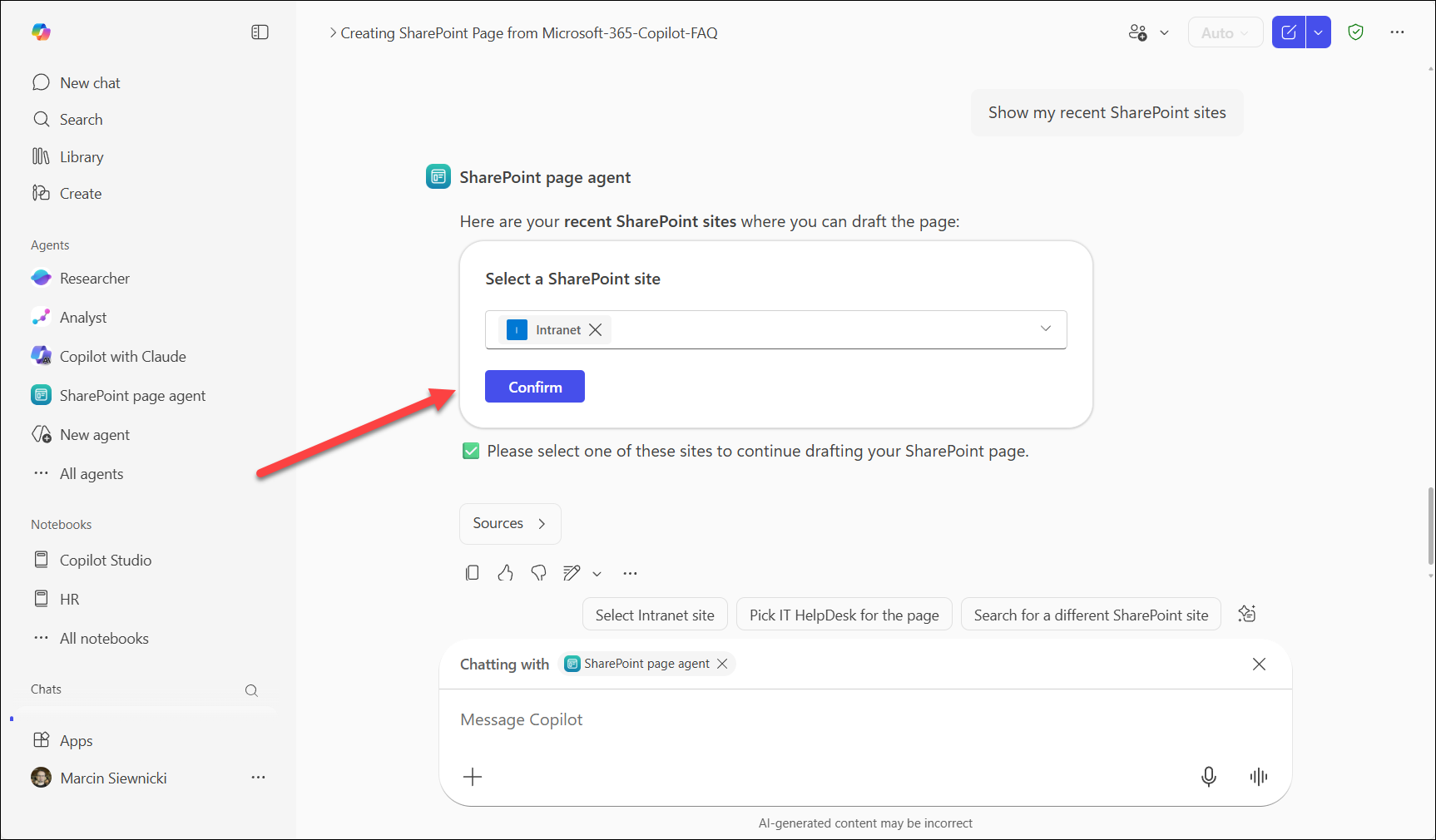 4. The agent gives a dedicated drop-down menu with SharePoint sites, and you can just select one of them. When you’re ready, just select the Confirm button.